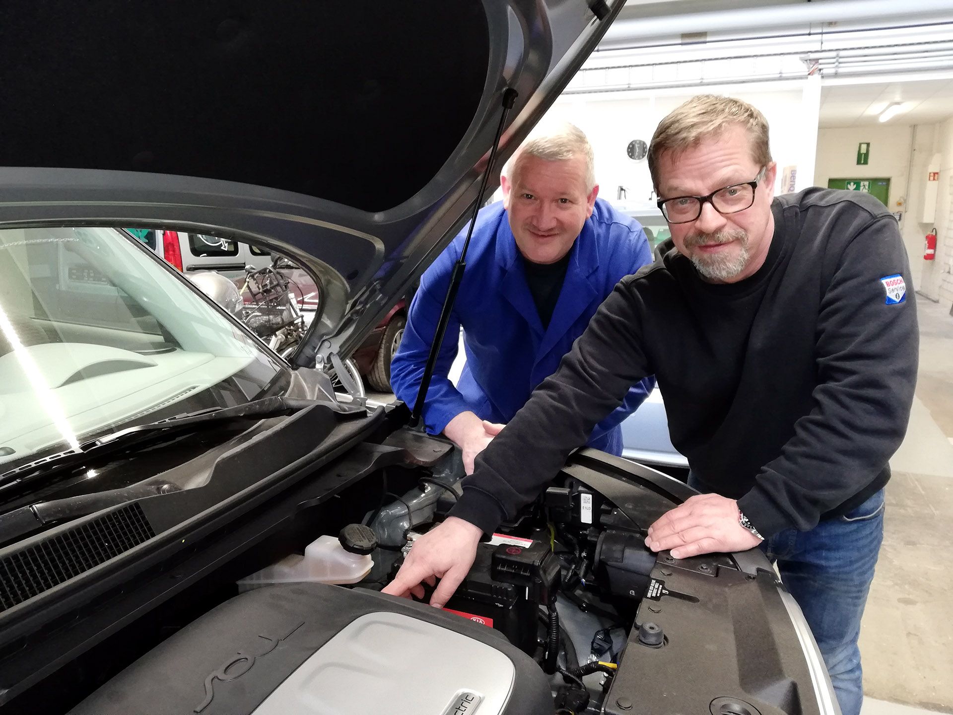 Eckhard Krause und Robert Jeromin über dem Motor eines Elektroautos. Dieses wurde extra für die Werkstatt angeschafft, damit die Azubis dieses wichtige und zukunftsorientierte Feld in der Praxis erlernen können.